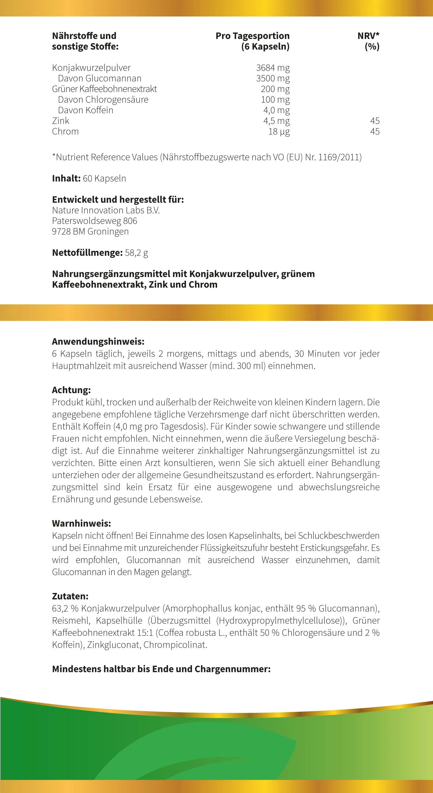 BodyFokus Belly Burn enthält das wertvolle Glucomannan aus der Konjakwurzel, das im Rahmen einer kalorienarmen Ernährung zu Gewichtsverlust beiträgt. Außerdem sind ein Extrakt aus grünen Kaffeebohnen sowie die Spurenelemente Zink und Chrom enthalten.